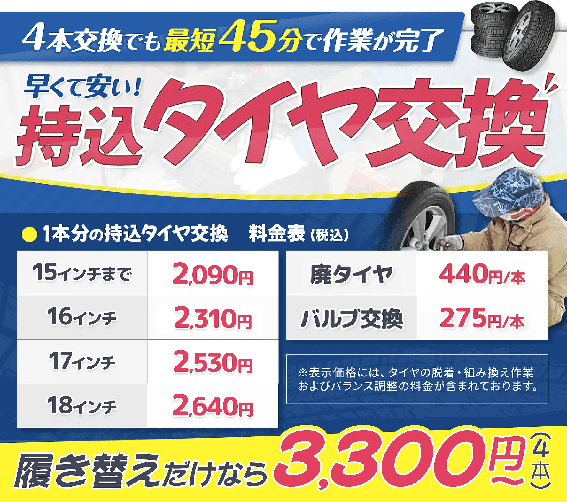 ※タイヤ脱着・組み換え・バランス代を含みます。